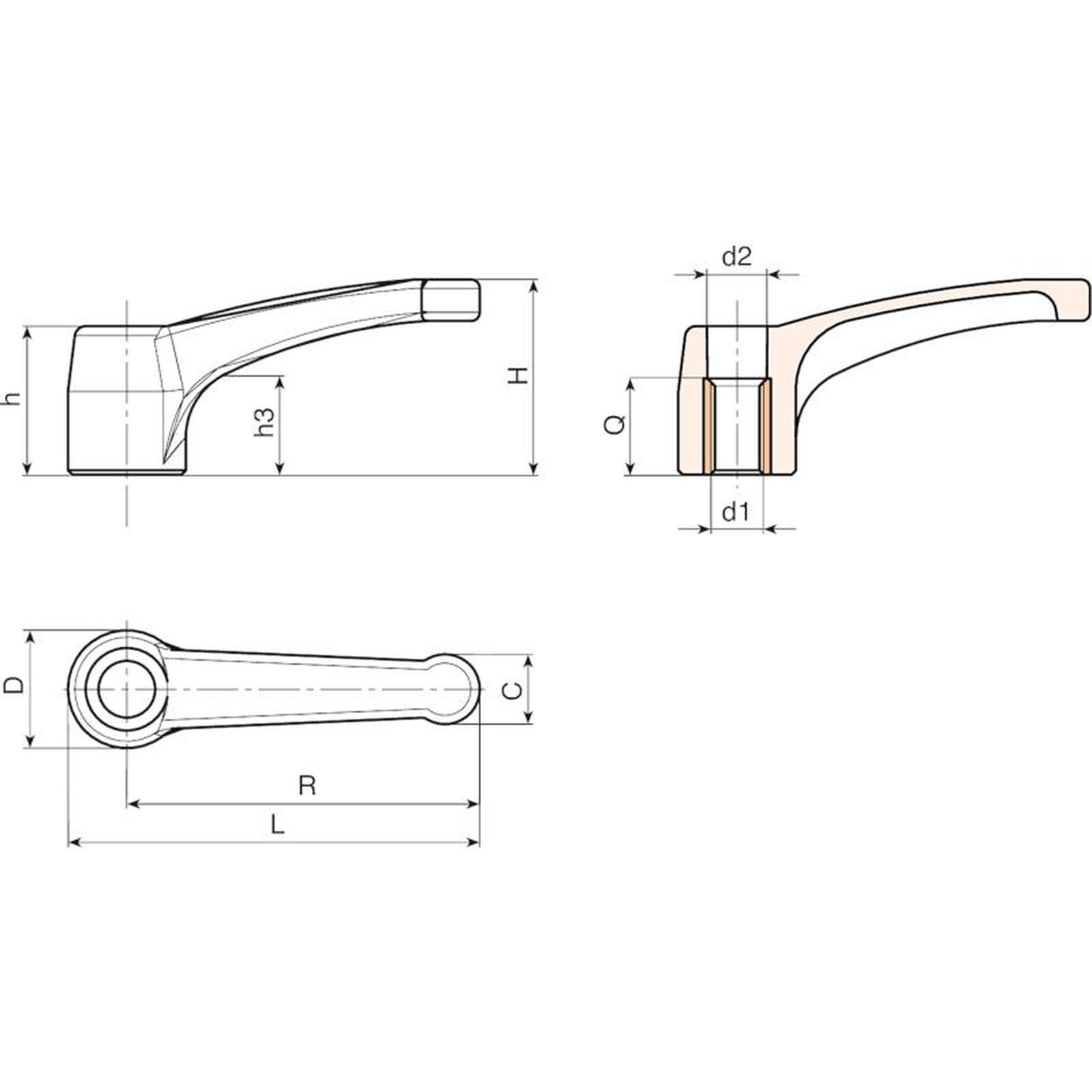 | Code | Art. | L | R | H | D | c | h | h1 | d2 | d1 6H | Q | Poids (g) |