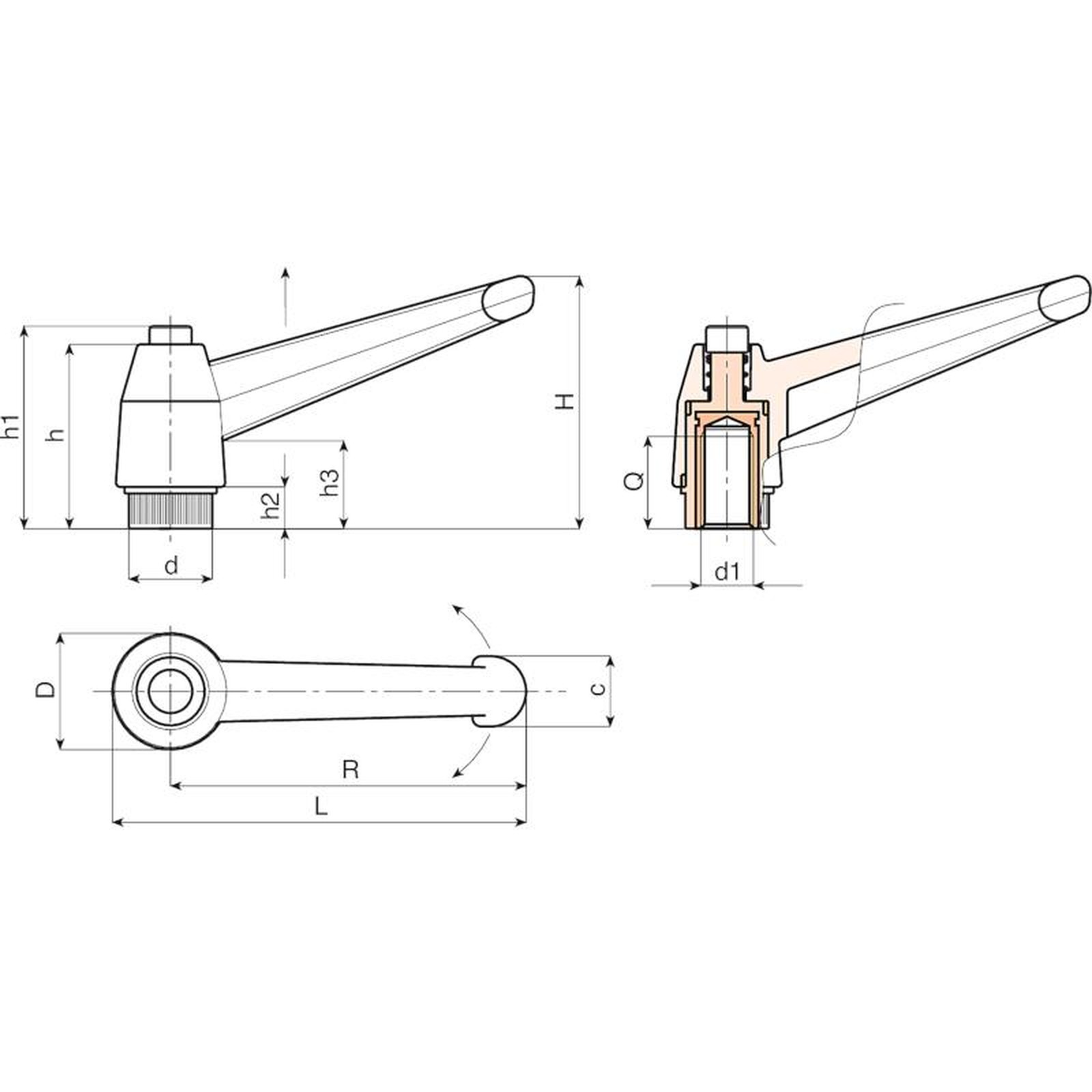 | Code | Art. | L | R | H | D | d | c | h | h1 | h2 | h3 | d1 6H | Q | Poids (g) |