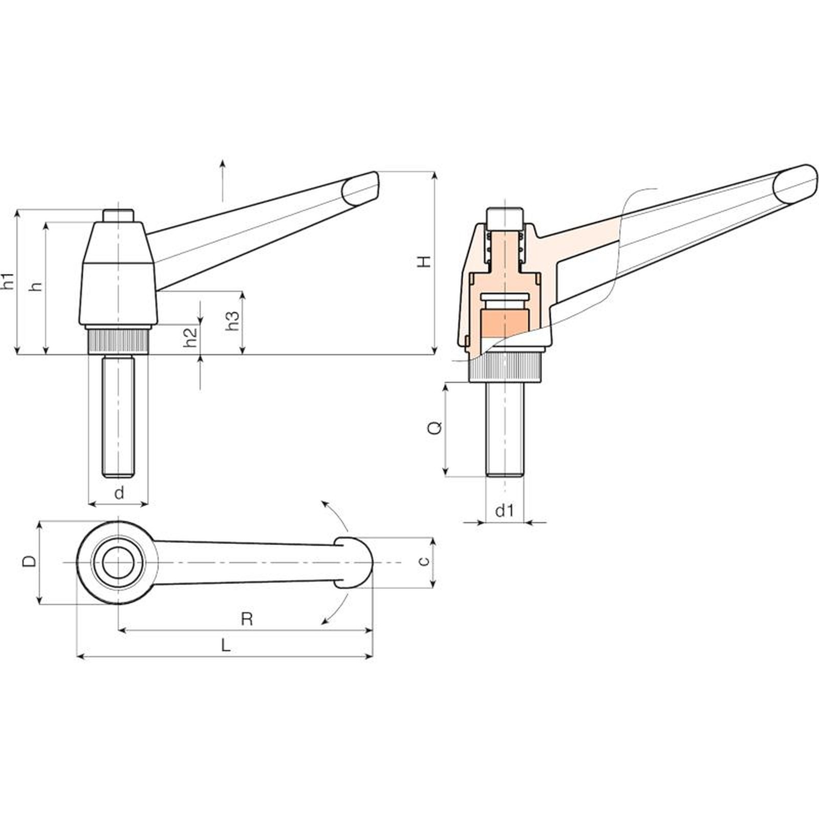 | Code | Art. | L | R | H | D | d | c | h | h1 | h2 | h3 | LM | d1 6g | Q | Poids (g) |