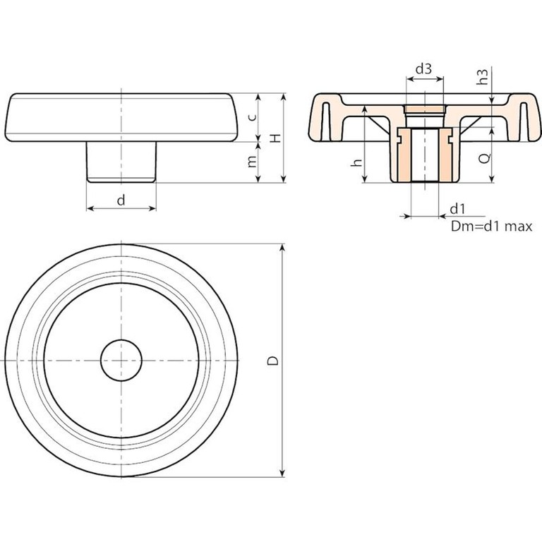 | Code | Art. | D | H | h | d | m | c | d3 | h3 | Dm | d1 H10 | Q | Poids (g) |