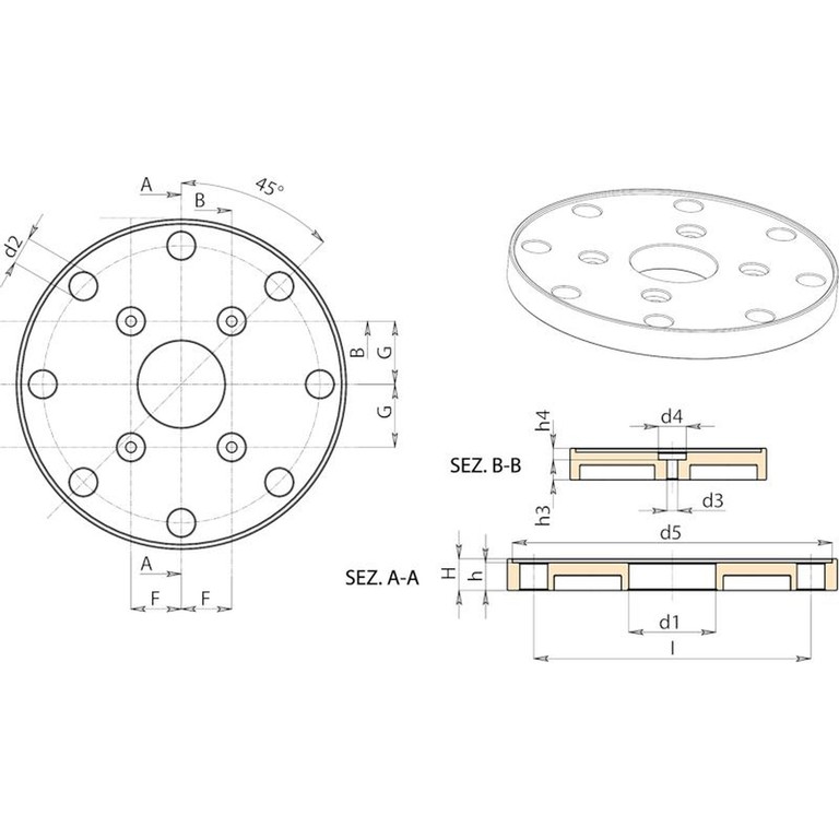 | Code | Art. | D | H | h | h3 | h4 | I | F | G | d2 | d3 | d4 | d5 | d1 | Poids (g) |