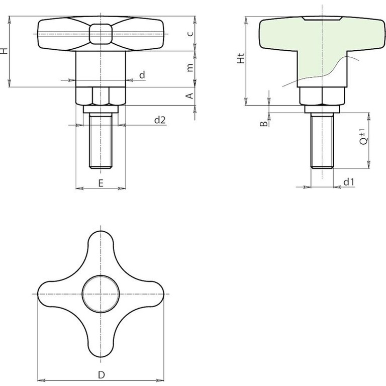 | Code | Art. | D | d | d2 | H | Ht | A | B | E | m | c | d1 6g | Q | Poids (g) |