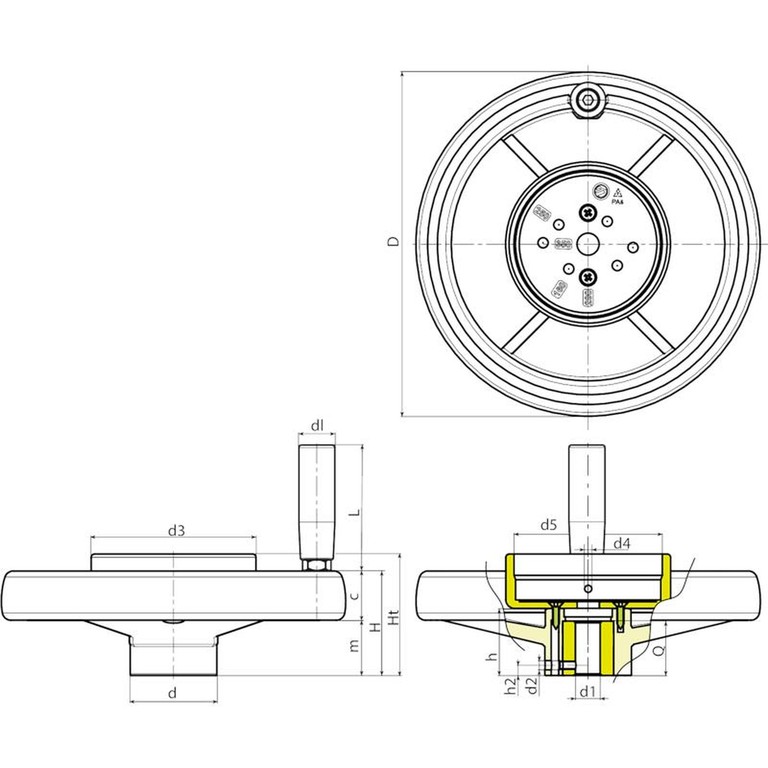 | Code | art. | D | d | m | c | H | Ht | h | h2 | d2 | d3 | d4 | d5 ±0,5 | Dm | d1 H10 | dl | L | Q | Poids (g) |