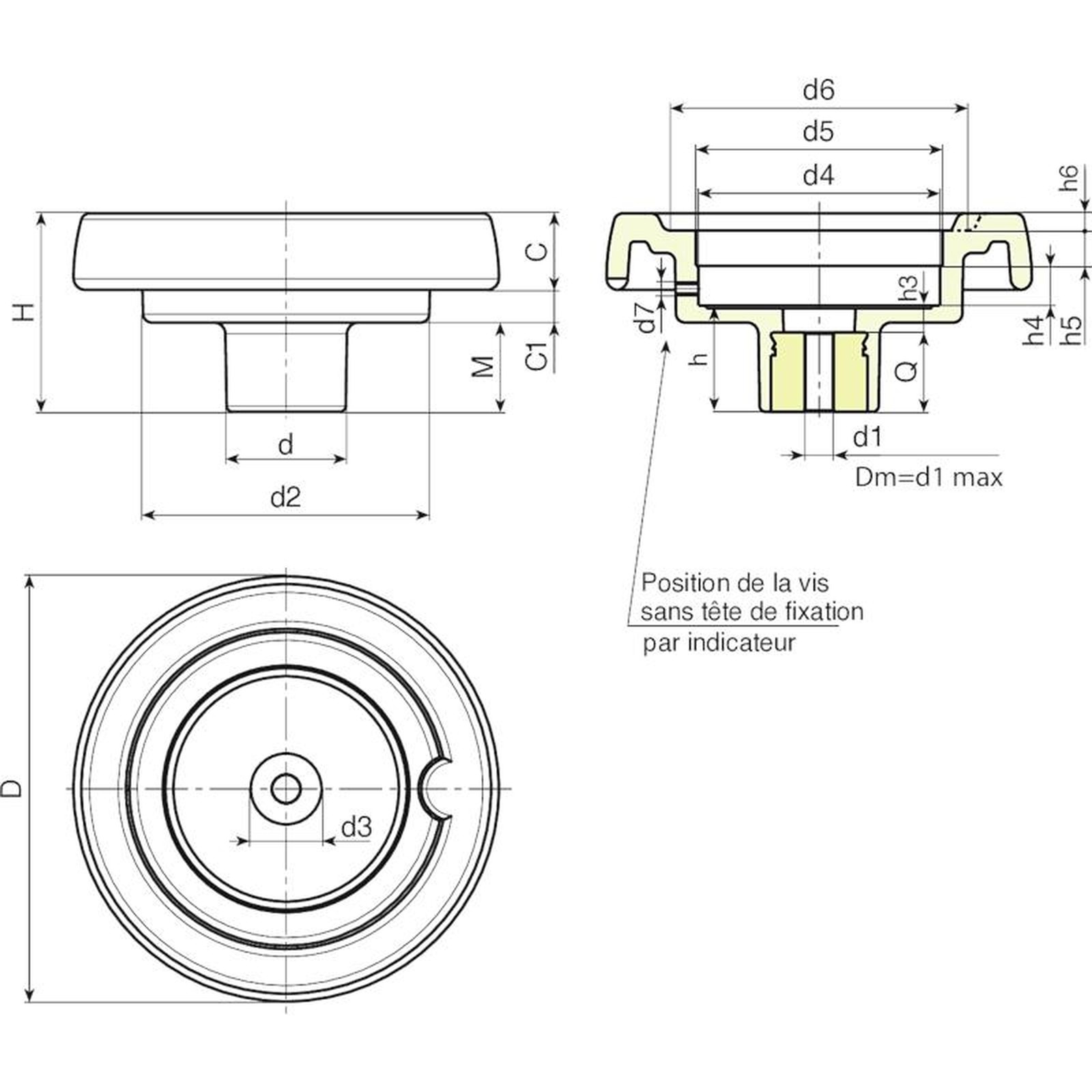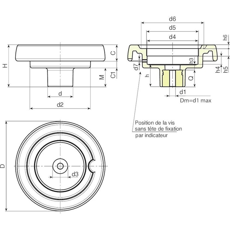 | Code | art. | D | H | d | d2 | M | C | C1 | d3 | d4 | d5 | d6 | d7 | h | h3 | h4 | h5 | h6 | Dm | d1 | Q | Poids (g) |