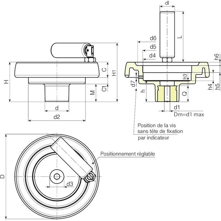 | Code | art. | D | H | H1 | d | d2 | M | C | C1 | d3 | d4 | d5 | d6 | d7 | h | h3 | h4 | h5 | h6 | dl | L | Dm | d1 | Q | Poids (g) |