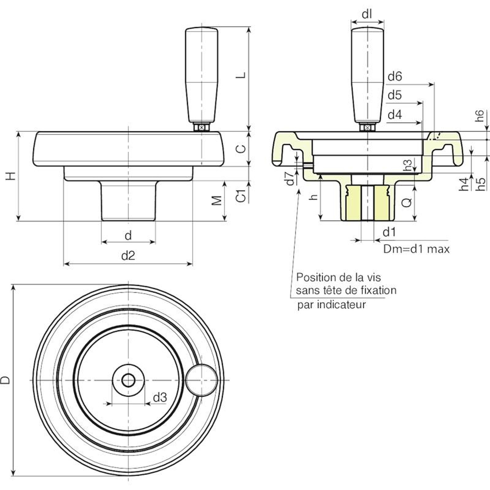 | Code | art. | D | H | d | d2 | M | C | C1 | d3 | d4 | d5 | d6 | d7 | h | h3 | h4 | h5 | h6 | dl | L | Dm | d1 | Q | Poids (g) |