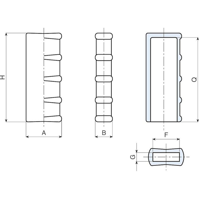 | Code | art. | H | A | B | G ± 0,2 | F ± 0,2 | Q | Poids (g) |
