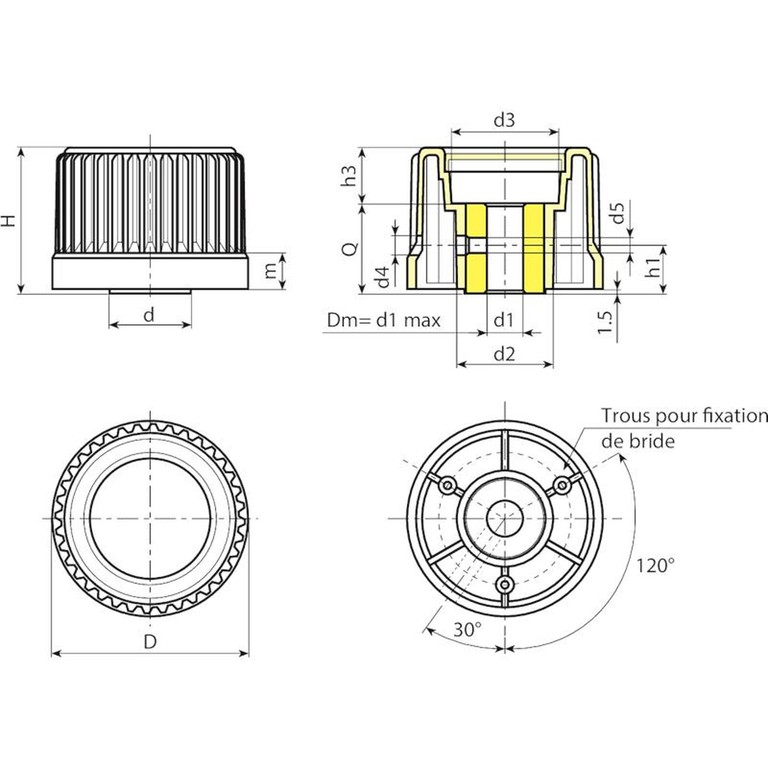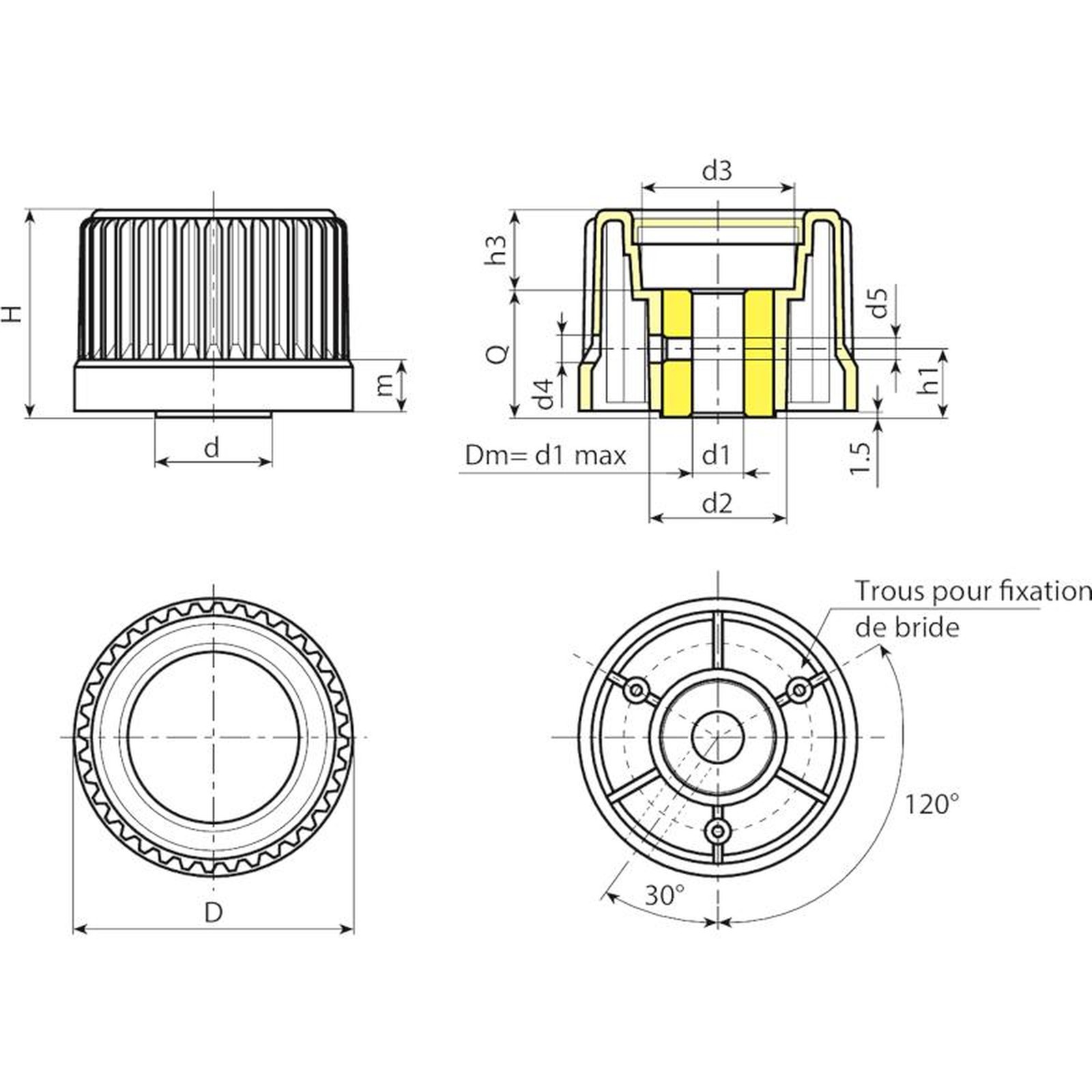 | Code | Art. | D | H | m | d | d2 | d3 | d4 | d5 | h1 | h3 | Dm | d1 H10 | Q | Poids (g) |