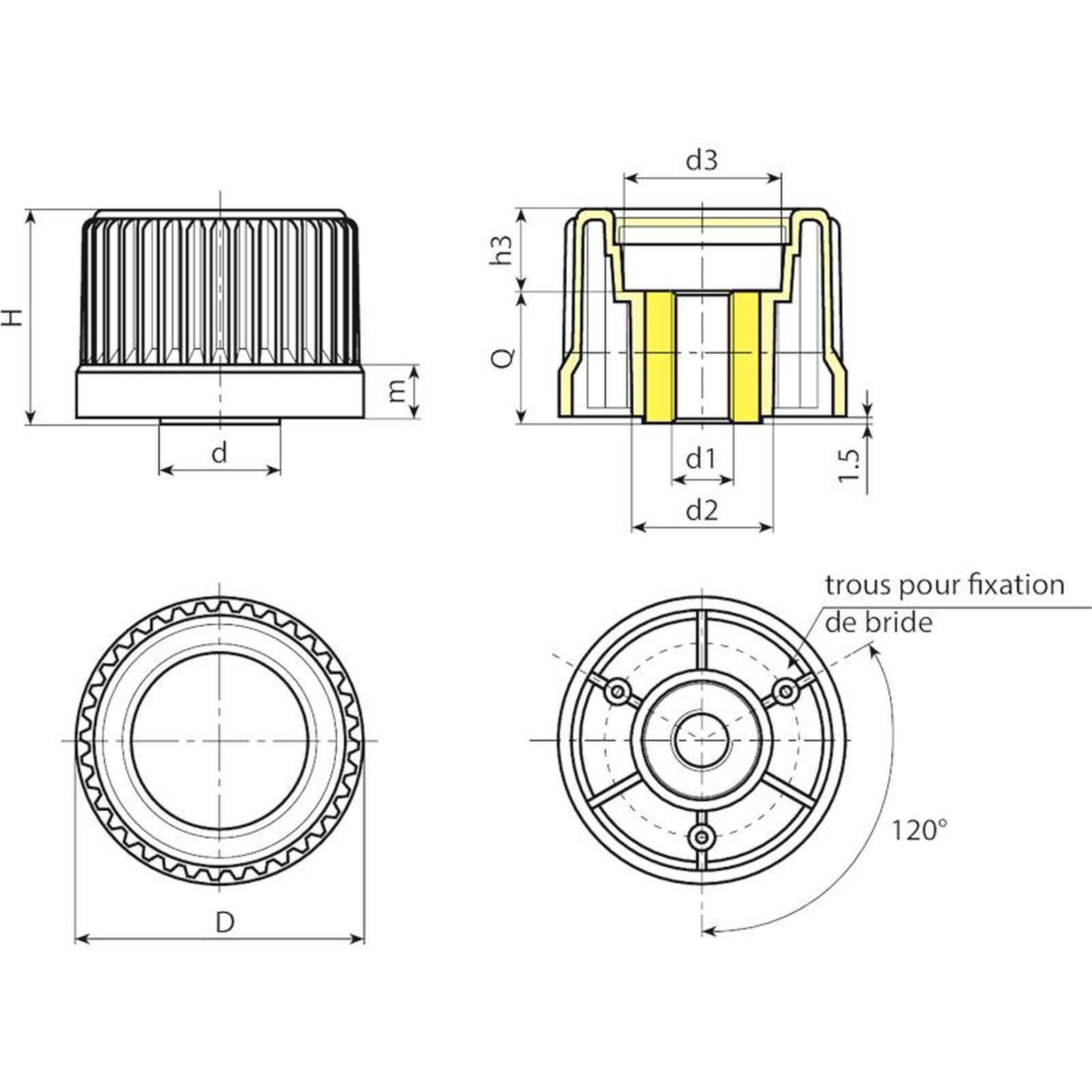 | Code | Art. | D | H | m | d | d2 | d3 | h3 | d1 6H | Q | Poids (g) |
