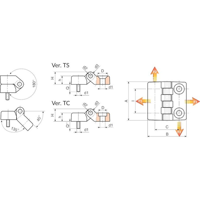 | Code | art. | I | C | A | B | h | H | D | d2 | d3 | d1 | Q | Poids (g) | F1 (N) | F2 (N) |