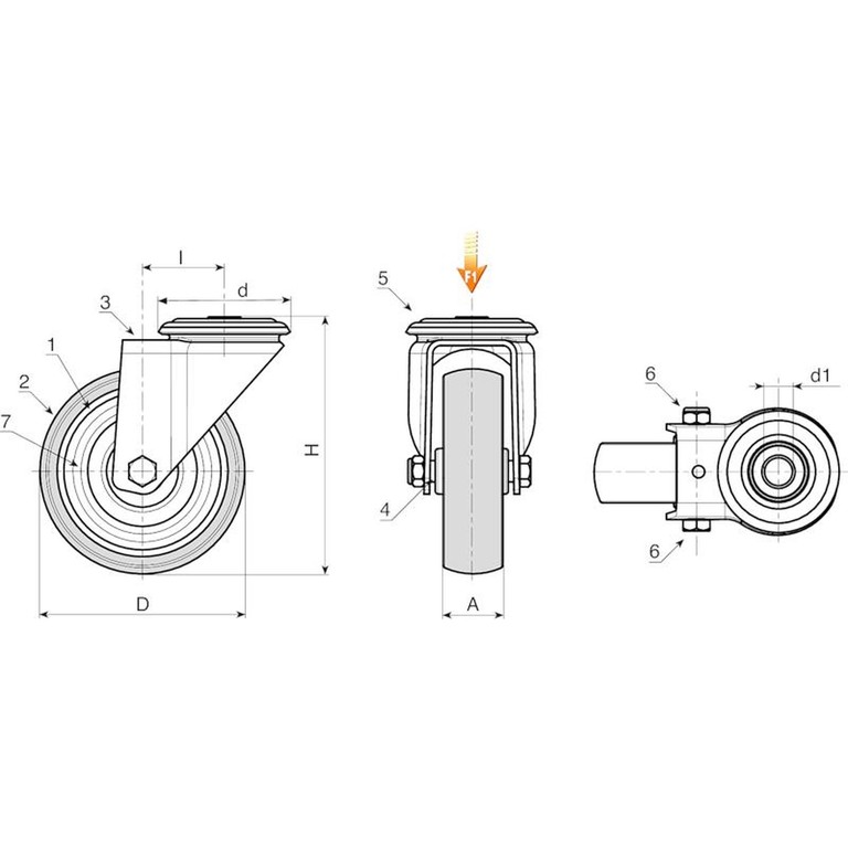 | Code | art. | D | A | H | I | d | d1 H7 | Poids (g) | F1 (Kg) |