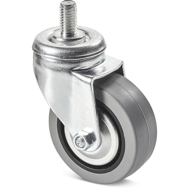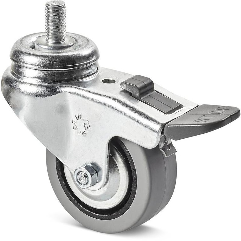 ROUE EN POLYPROPYLÈNE / CAOUTCHOUC AVEC SUPPORT TOURNANT ROND EN ACIER, PIVOT FILETÉ ET FREIN