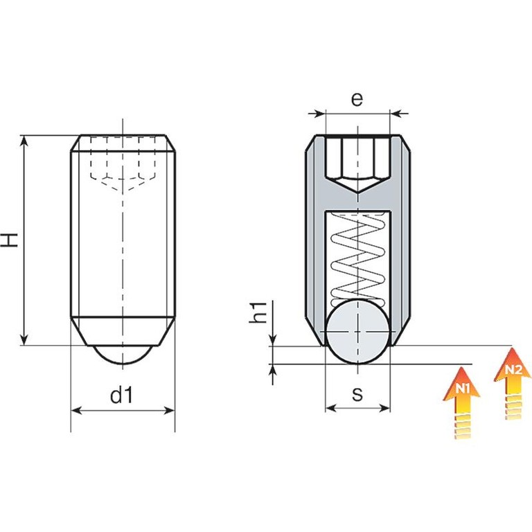 | Code | art. | s | H | h1 | e | N1 (N) | N2 (N) | d1 6H | Poids (g) |