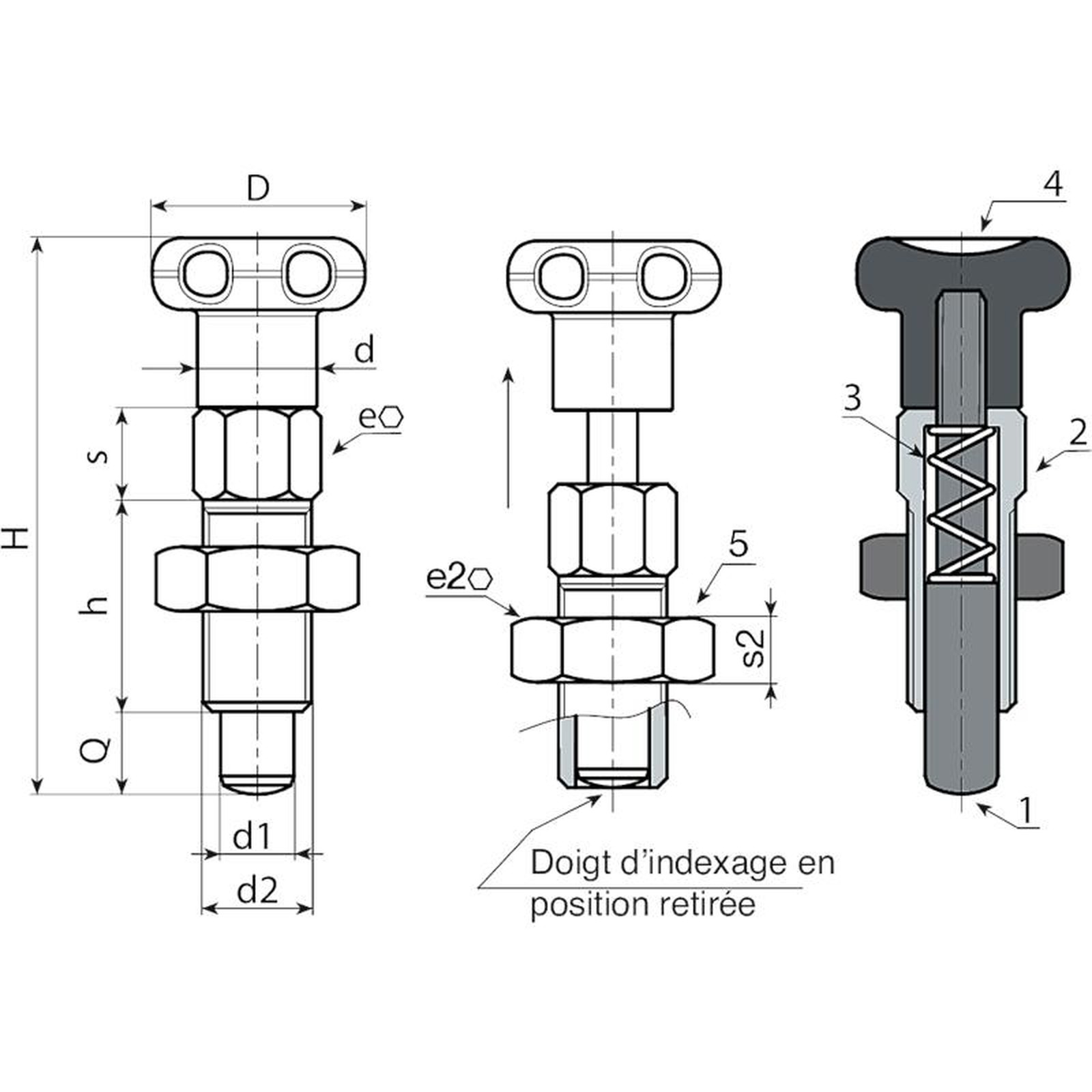 (2) Corps doigt d’indexage fileté en acier inox (Aisi 303).