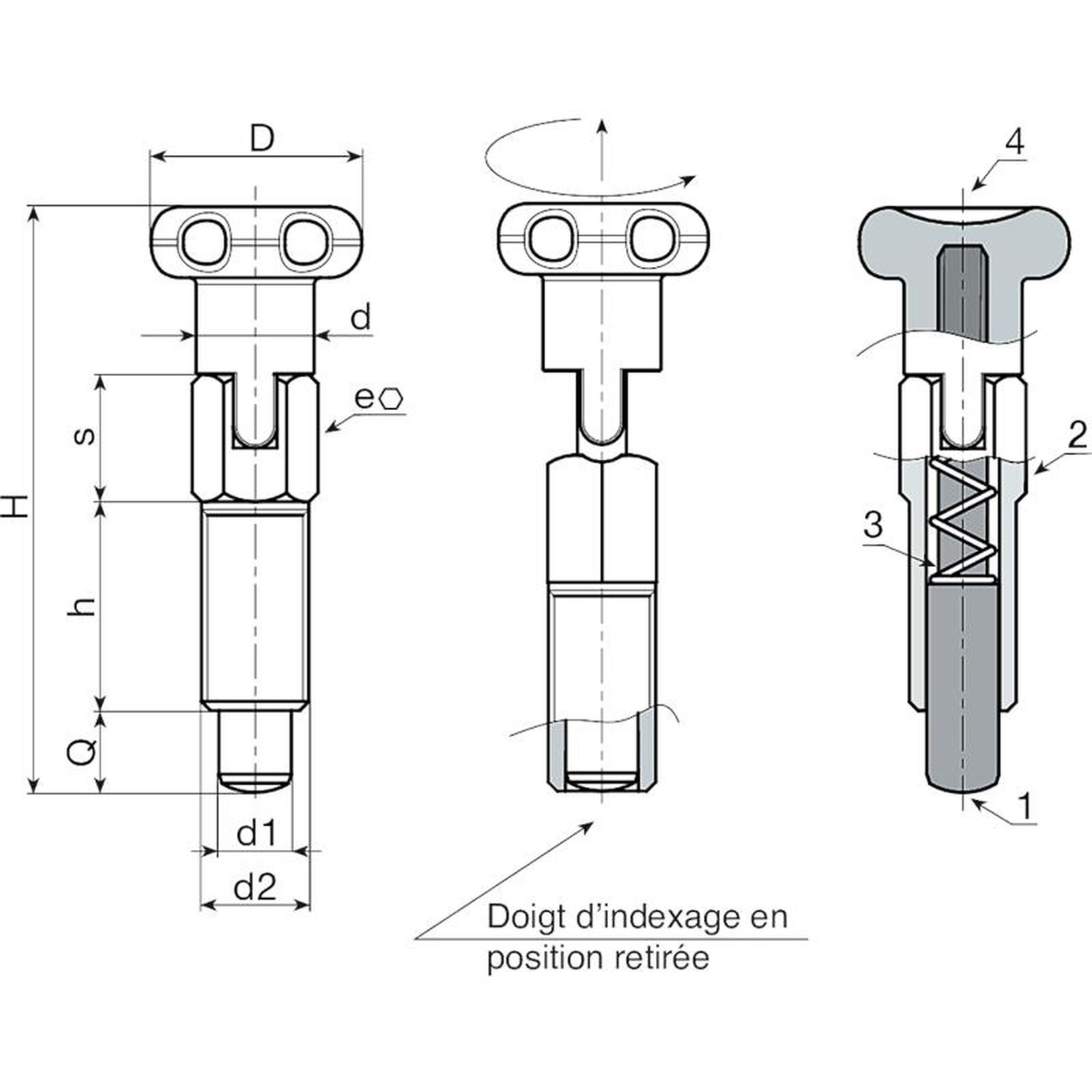 (2) Corps doigt d’indexage fileté verrouillable en acier inox (Aisi 303).