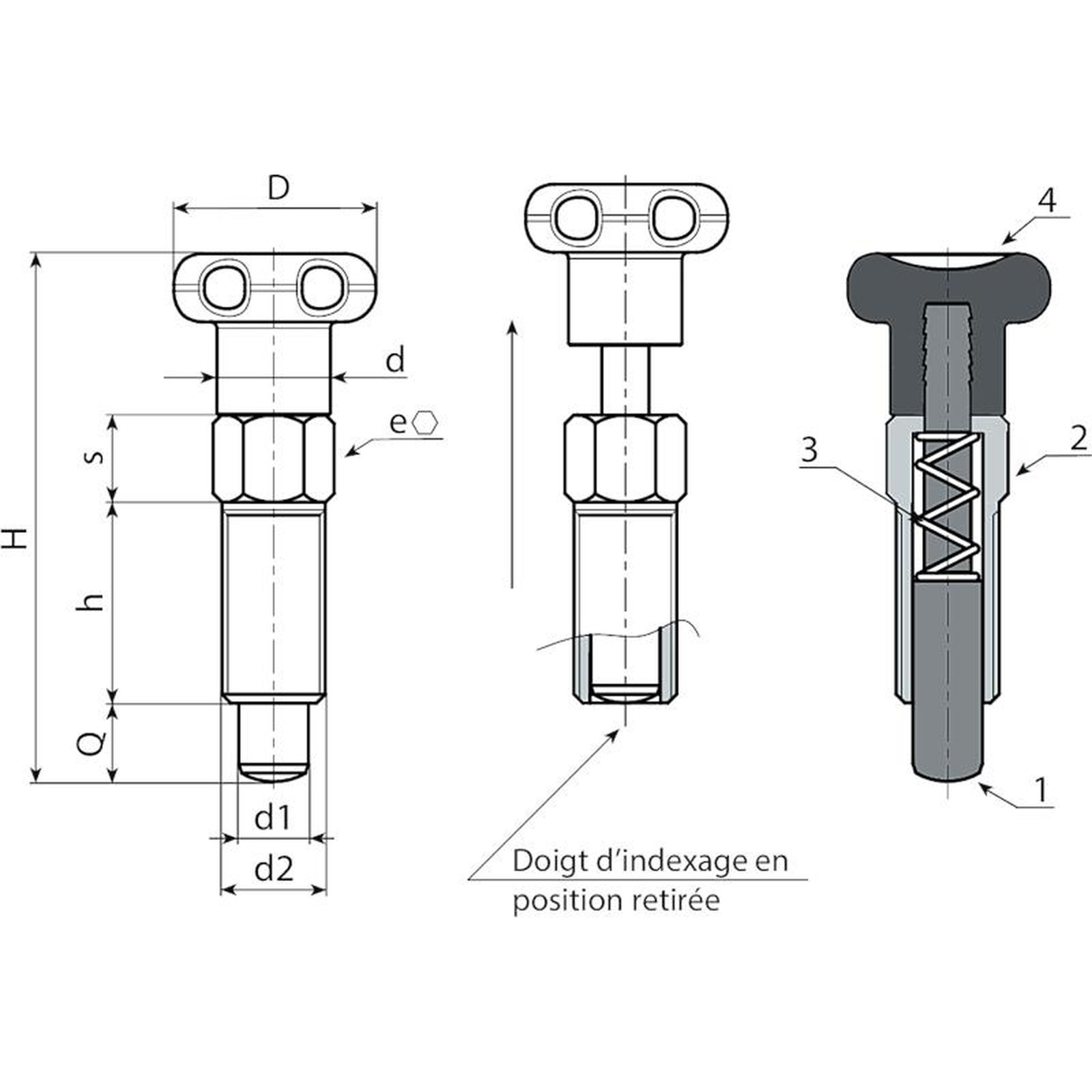 (2) Corps doigt d’indexage fileté en acier inox (Aisi 303).