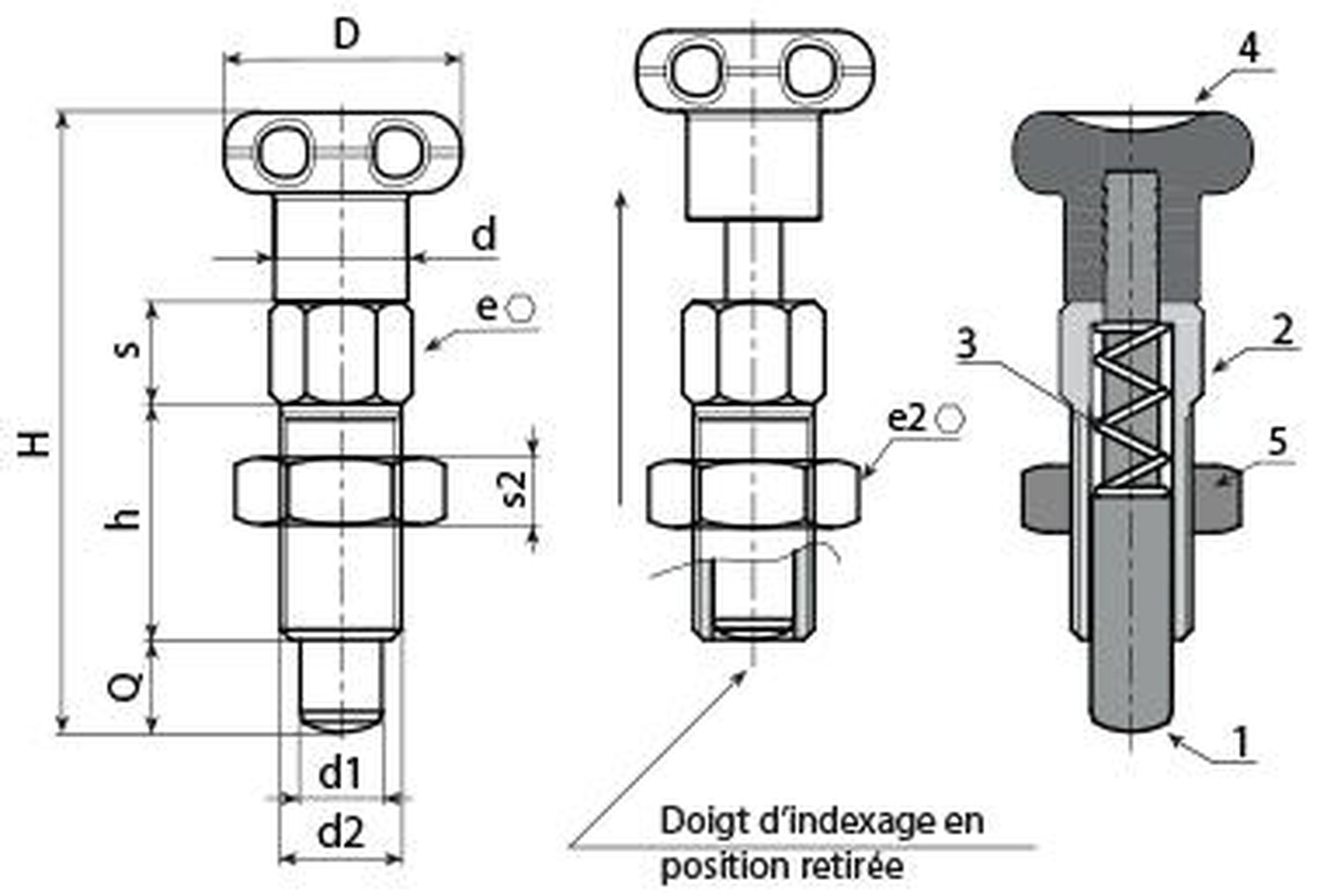 (2) Corps doigt d’indexage fileté en acier inox (Aisi 303).