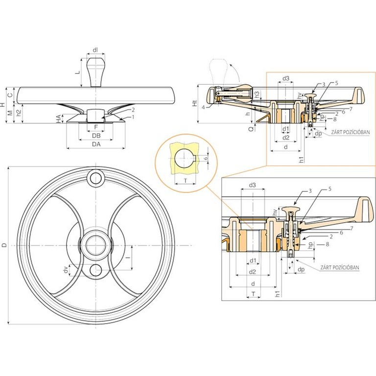 (8) Horganyzott acél záró dugattyú. Fészek rögzítéshez használt 5-ös imbuszkulcshoz. Dugattyúlöket: 10 mm. Hasznos kinyúlás a kézikerékről: 8 mm.