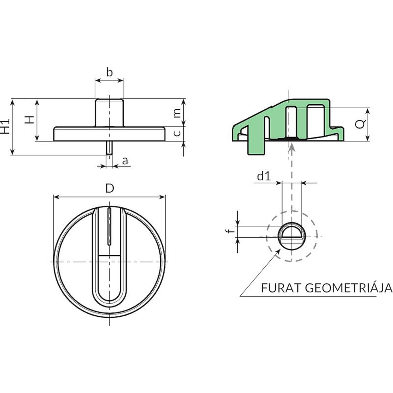 | Kód | art. | D | H | H1 | a | b | c | m | f | d1 | Q | Tömeg (g) |