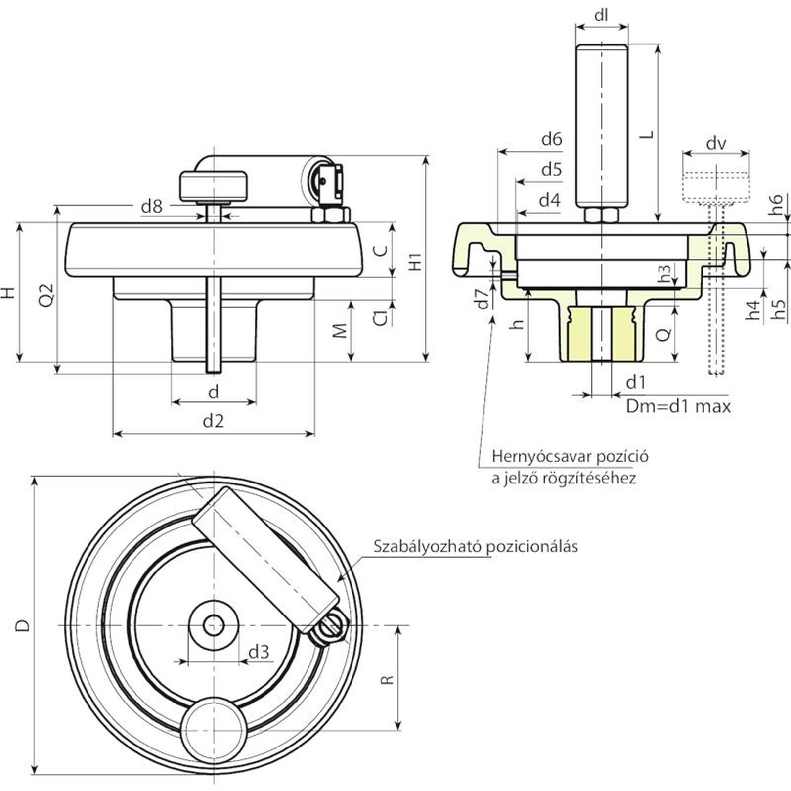 Szabályozó kézikerekek peremmel gravitációs pozíciójelzőhöz