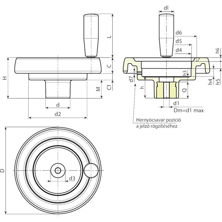 Kód | art. | D | H | d | d2 | M | C | C1 | d3 | d4 | d5 | d6 | d7 | h | h3 | h4 | h5 | h6 | dl | L | Dm | d1 | Q | Tömeg (g) |