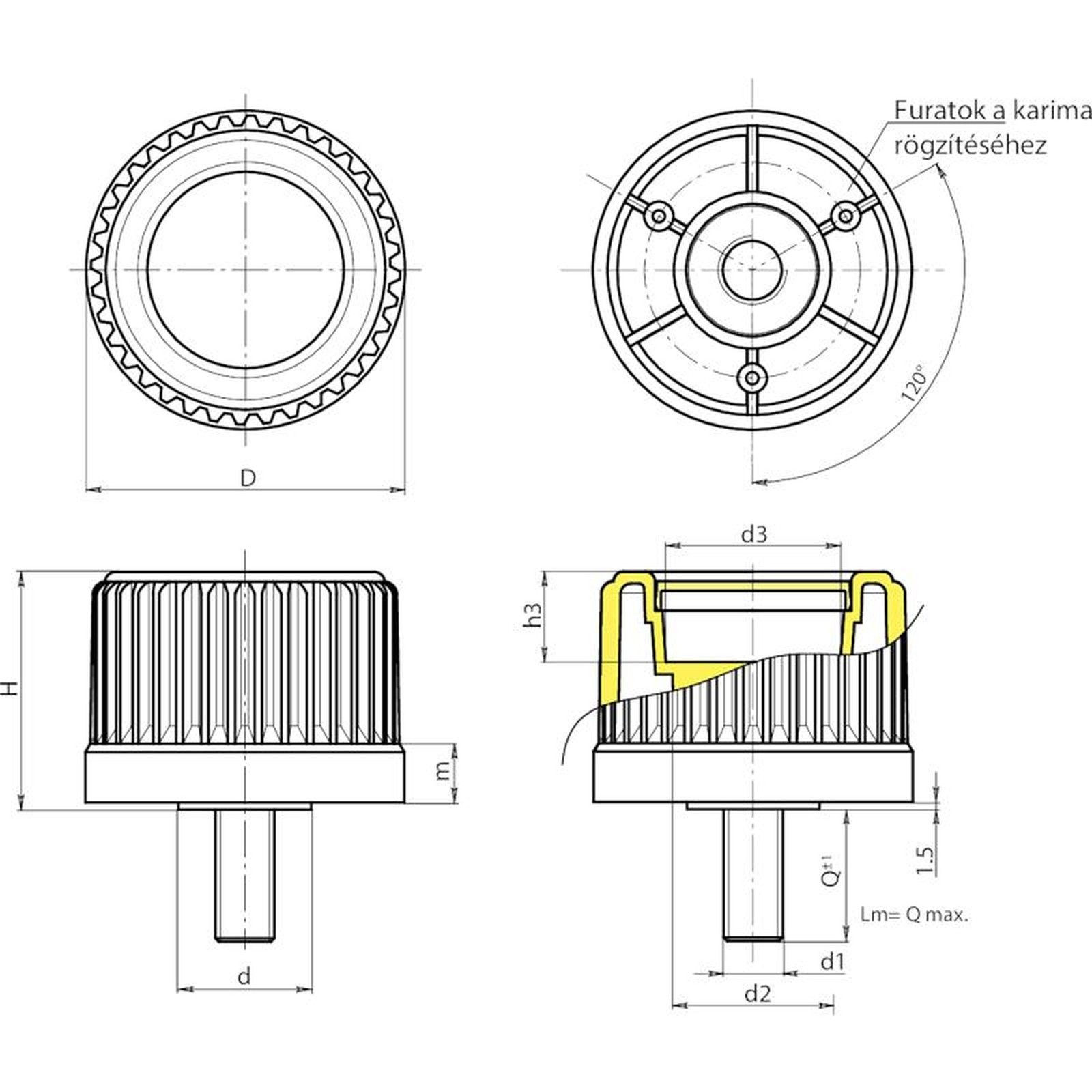 | Kód | Art. | D | H | m | d | d2 | d3 | h3 | LM | d1 6g | Q | Tömeg (g) |