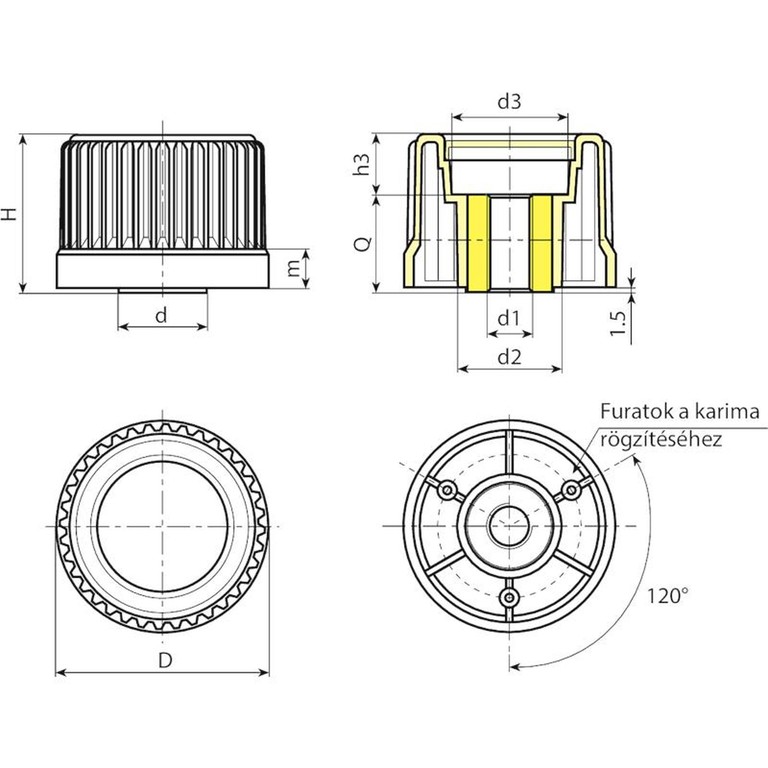 | Kód | Art. | D | H | m | d | d2 | d3 | h3 | d1 6H | Q | Tömeg (g) |
