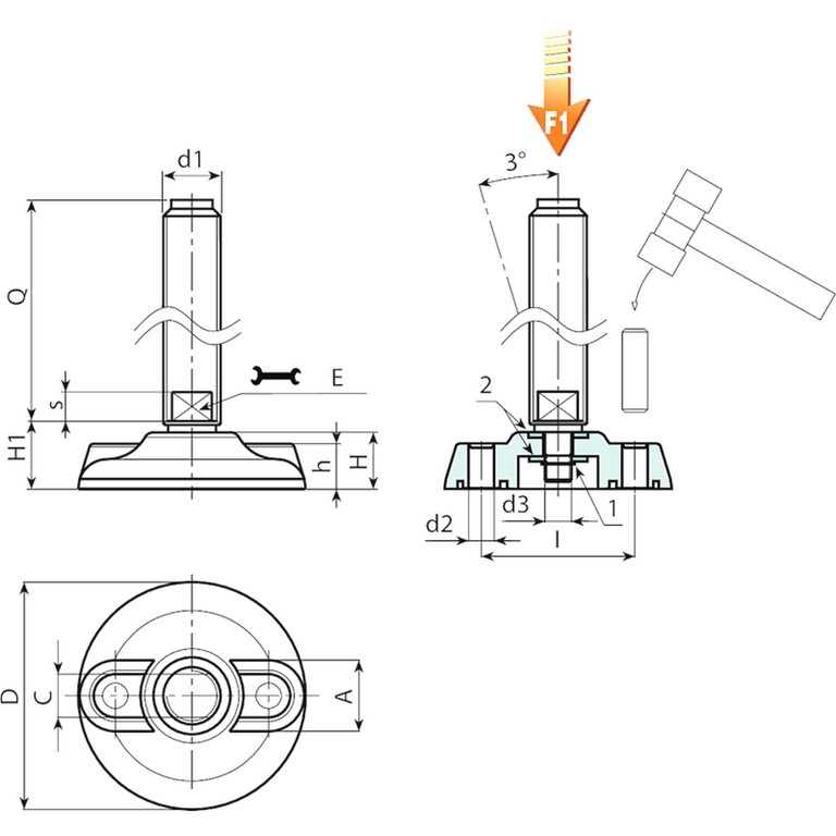 Kód | Art. | D | H | I | H1 | h | A | s | d2 | d3 | E | d1 6g | Q | Tömeg (g) | F1 (kN) |