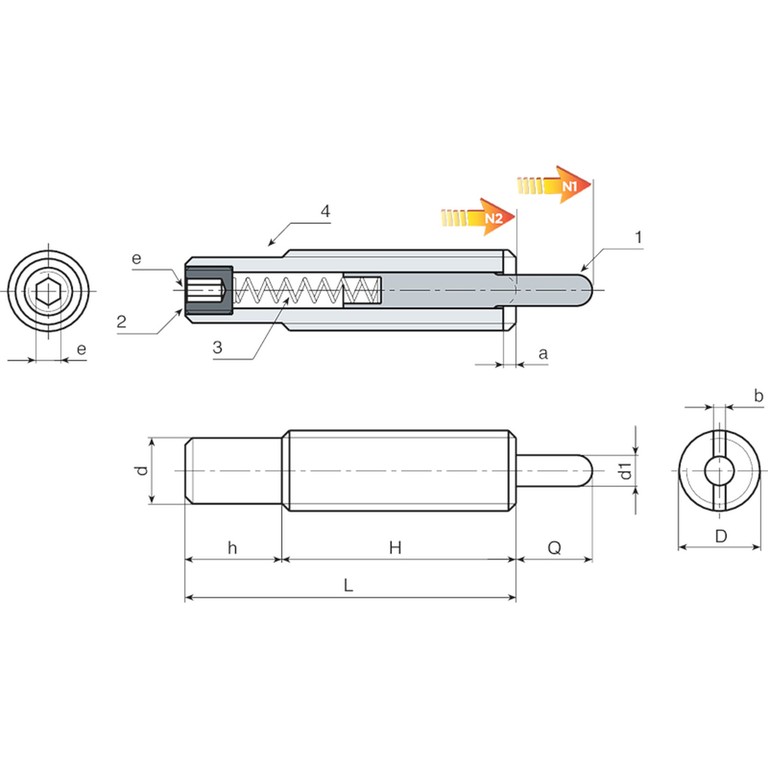 Kód | art. | L | D | H | h | d | a | b | e | d1 | Q | Tömeg (g) | N1 (N) | N2 (N) |