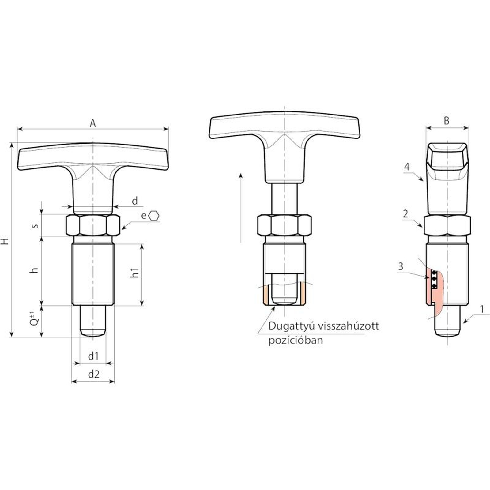 | Kód | Art. | A | B | H | h | h1 | d2 | d | e | s | d1 -0,02 -0,04 | Q | Tömeg (g) |