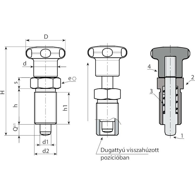 | Kód | Art. | D | H | h | h1 | d2 | d | e | s | d1 -0,02 -0,04 | Q | Tömeg (g) |
