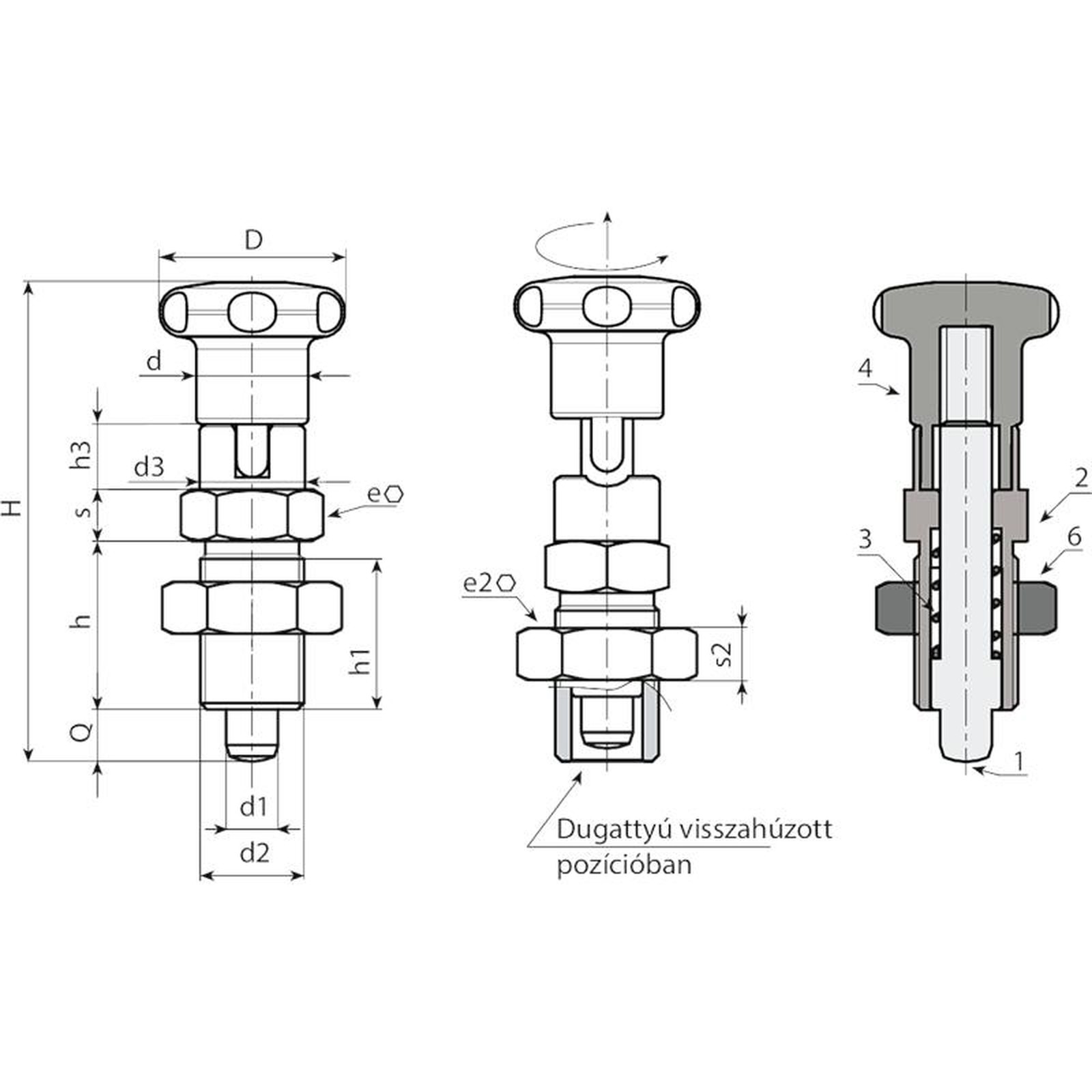 | Kód | Art. | D | H | h | h1 | h3 | d3 | d2 | d | e | s | e2 | s2 | d1 -0,02 -0,04 | Q | Tömeg (g) |