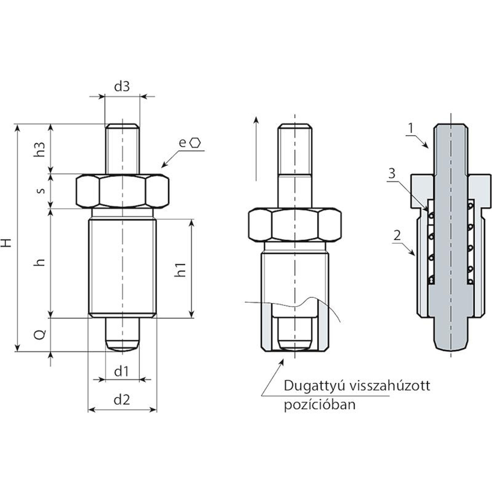 | Kód | Art. | H | h | h1 | d2 | d3 | h3 | e | s | d1 -0,02 -0,04 | Q | Tömeg (g) |