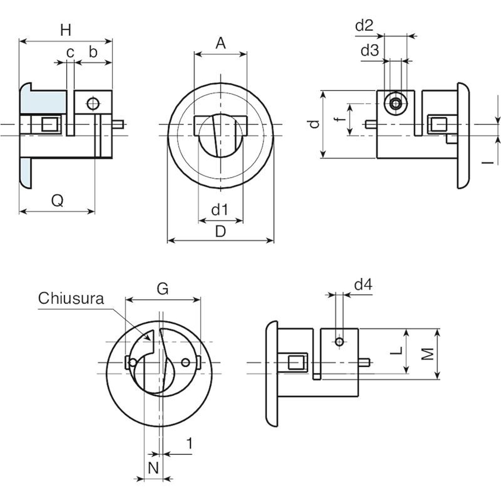 | Codice | art. | D | H | d | d1 | d2 | d3 | d4 | A | b | c | f | G | I | L | M | N | Q | Peso (g) |