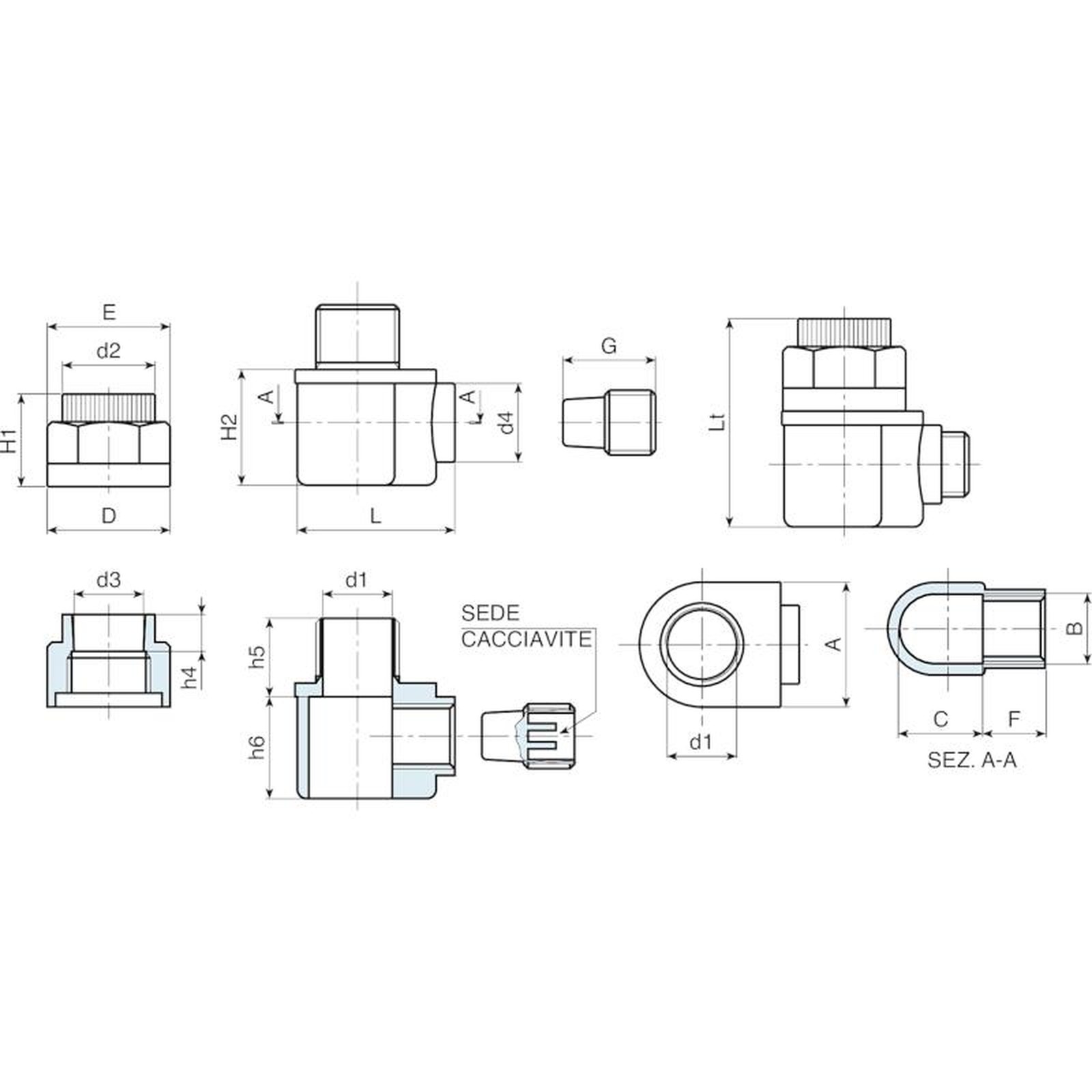 | Codice | art. | B | C | D | E | F | G | L | H1 | H2 | h4 | h5 | h6 | d1 | d2 | d3 | d4 | Lt | Peso (g) |
