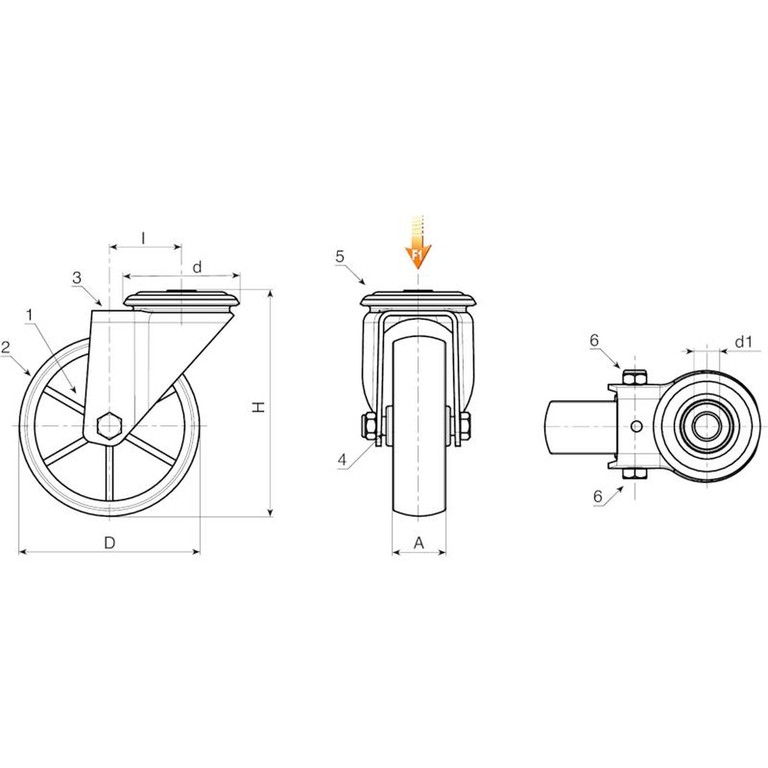 RUOTA MONOLITICA IN POLIAMMIDE CON SUPPORTO GIREVOLE TONDO IN ACCIAIO INOX E FORO LISCIO PASSANTE