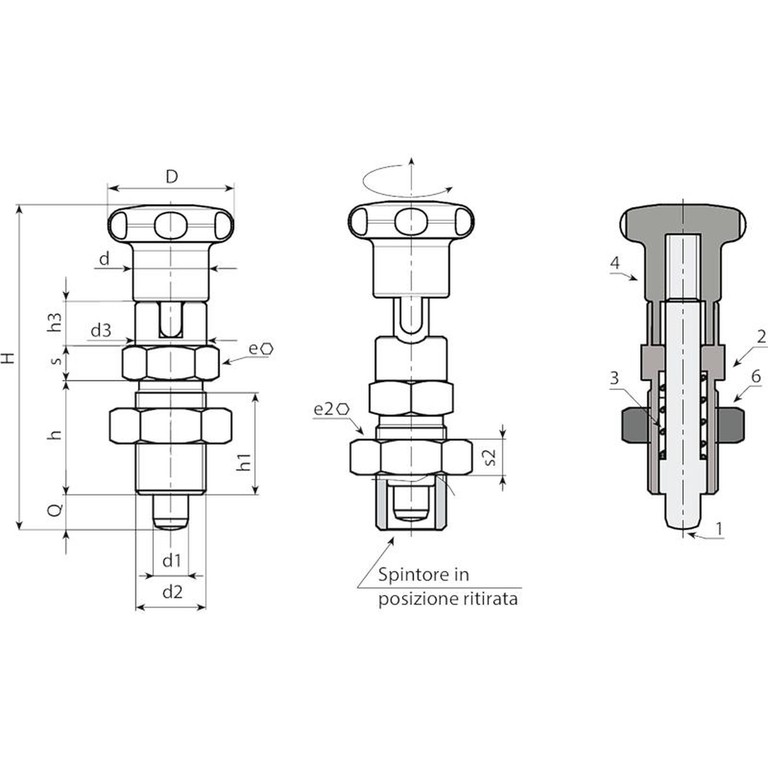 POMELLO CON SPINTORE FILETTATO IN ACCIAIO INOX INTEGRALE CON BLOCCAGGIO - CON DADO DI BLOCCAGGIO