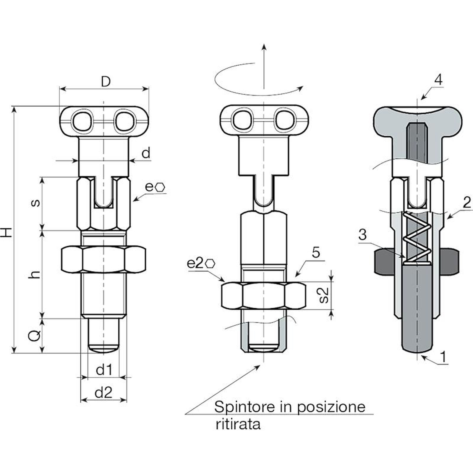 (2) Corpo spintore filettato con bloccaggio, in acciaio inox, (Aisi 303).