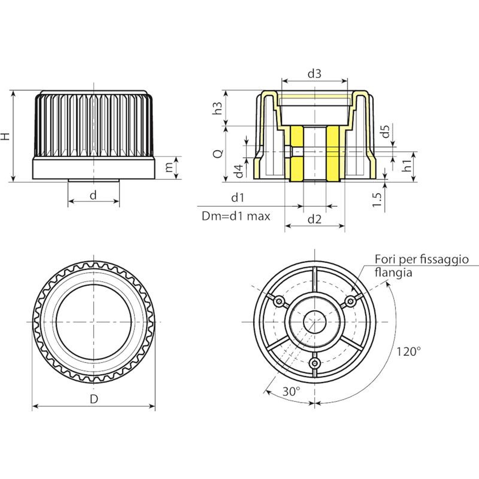 | Codice | Art. | D | H | m | d | d2 | d3 | d4 | d5 | h1 | h3 | Dm | d1 H10 | Q | Peso (g) |