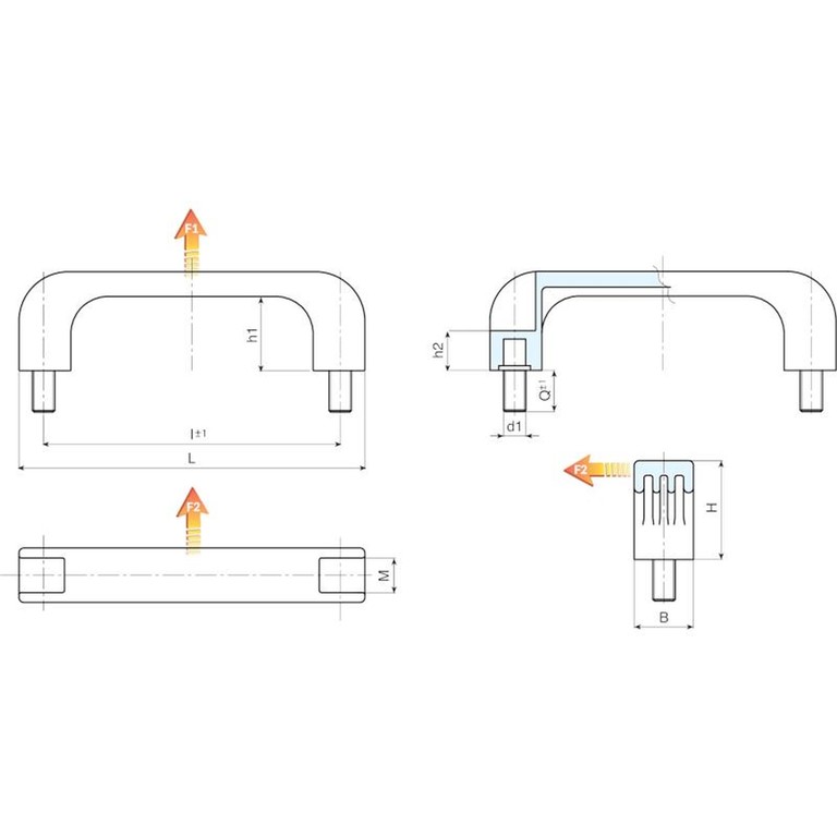 | Codice | art. | L | I ±1 | B | M | H | h1 | h2 | Q | d1 6g | Peso (g) | F1 (N) | F2 (N) |