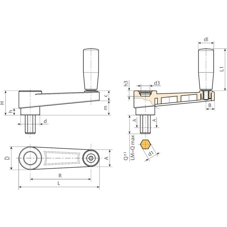 Codice | Art. | L | R | H | D | d | m | c | A | B | h | d3 | h3 | d1 H11 | Q | LM | dl | L1 | Peso (g) |