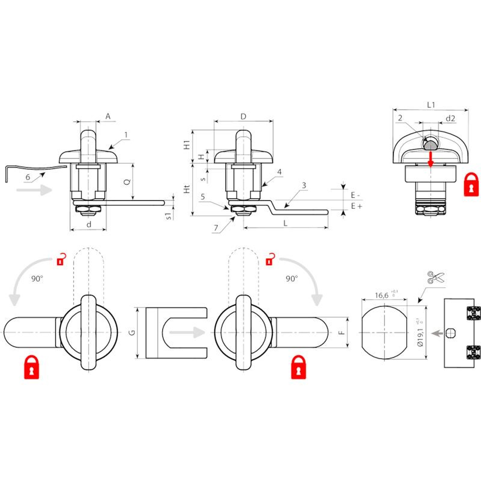 CHIUSURA UNIVERSALE 1/4 GIRO IN ZAMA FILETTO M19 CON POMELLO E FORO LUCCHETTO