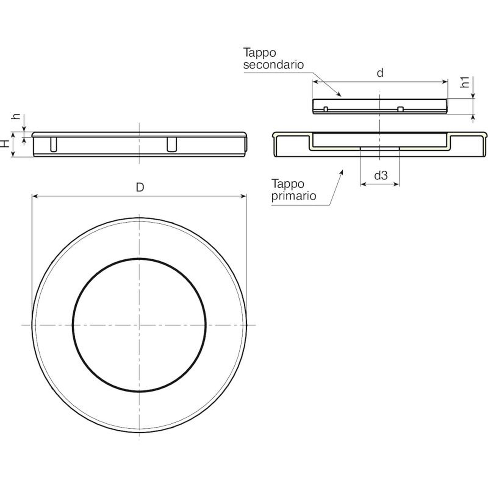 | Codice | art. | D | d | d3 | H | h | h1 | Peso (g) |