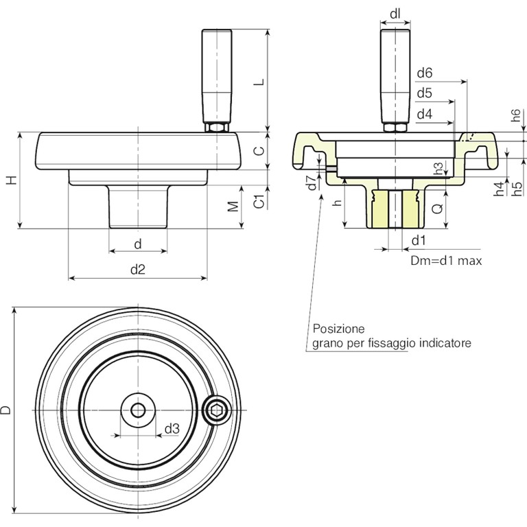 Codice | art. | D | H | d | d2 | M | C | C1 | d3 | d4 | d5 | d6 | d7 | h | h3 | h4 | h5 | h6 | dl | L | Dm | d1 | Q | Peso (g) |