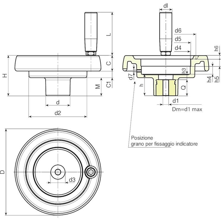 | Codice | art. | D | H | d | d2 | M | C | C1 | d3 | d4 | d5 | d6 | d7 | h | h3 | h4 | h5 | h6 | dl | L | Dm | d1 | Q | Peso (g) |