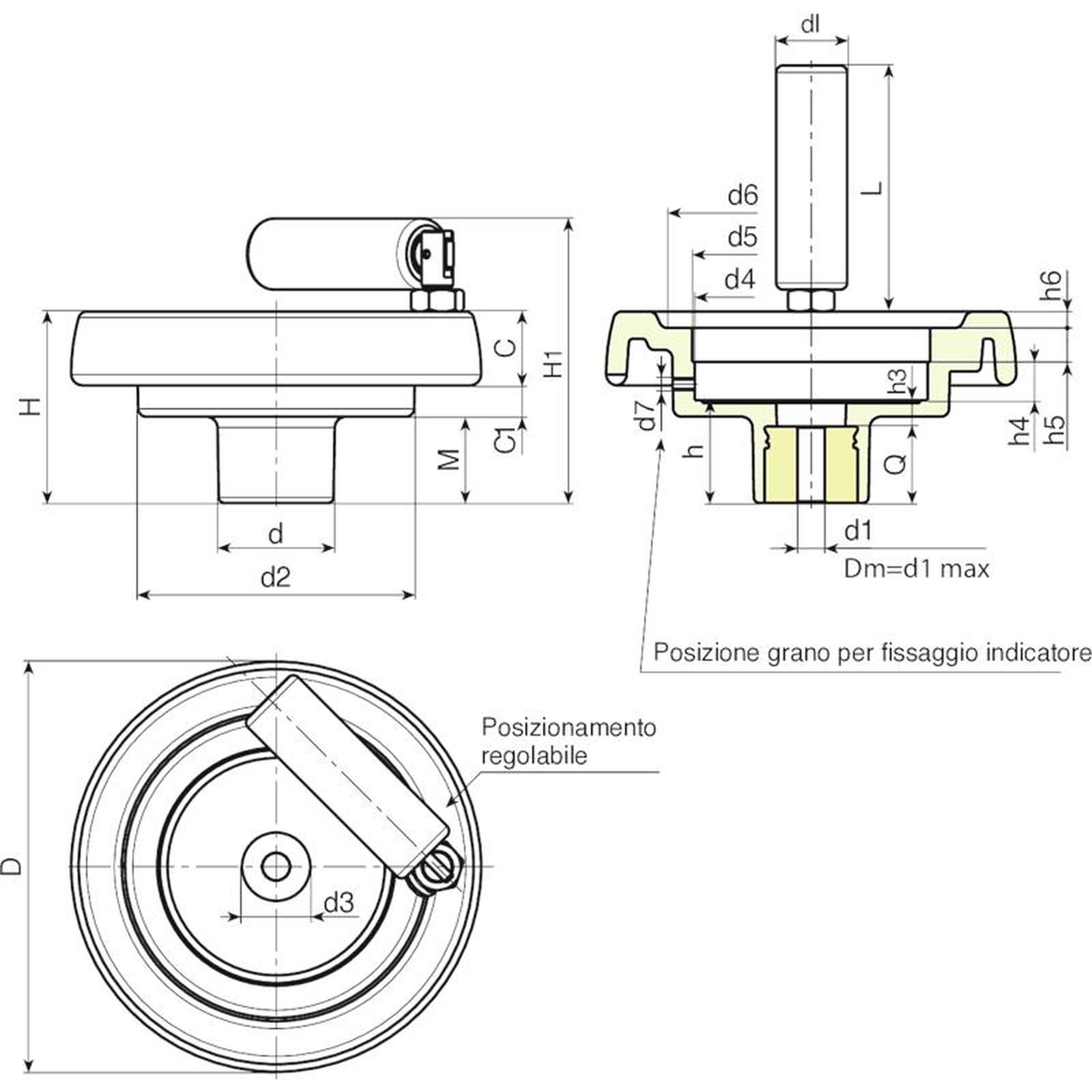 | Codice | art. | D | H | H1 | d | d2 | M | C | C1 | d3 | d4 | d5 | d6 | d7 | h | h3 | h4 | h5 | h6 | dl | L | Dm | d1 | Q | Peso (g) |