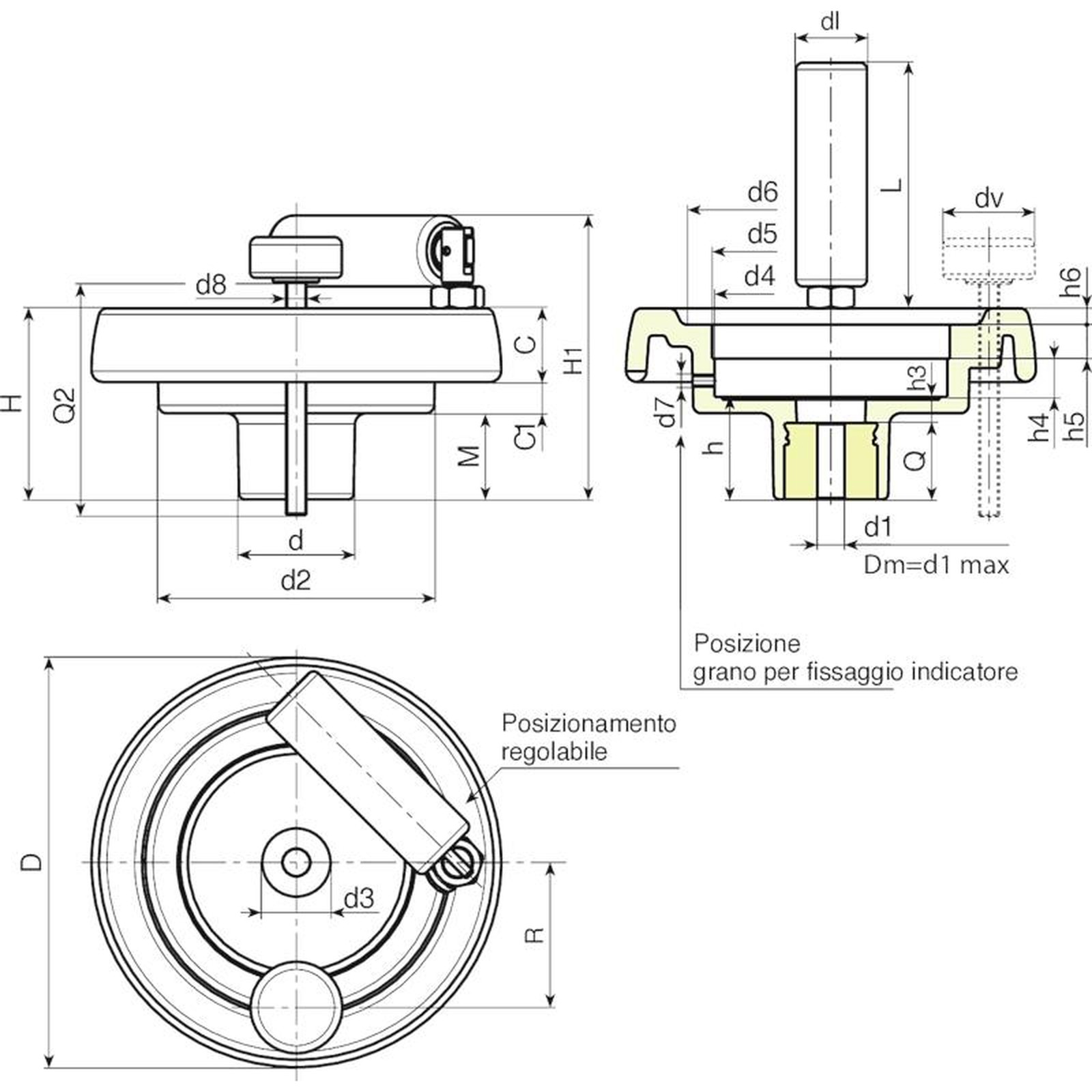 | Codice | art. | D | H | H1 | d | d2 | M | C | C1 | d3 | d4 | d5 | d6 | d7 | h | h3 | h4 | h5 | h6 | R | d8 | dl | L | Dm | d1 | Q | Peso (g) |