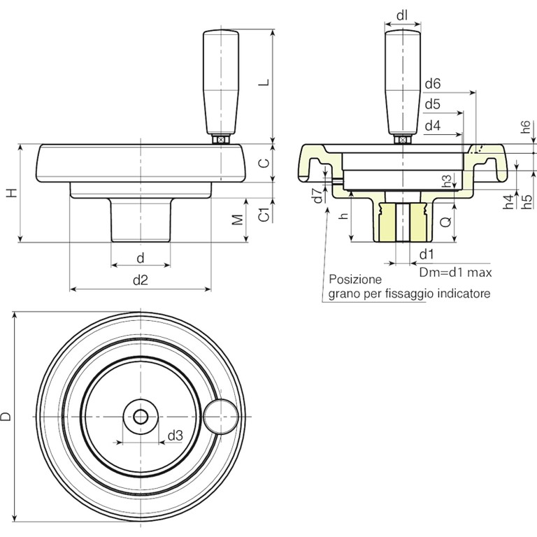 Codice | art. | D | H | d | d2 | M | C | C1 | d3 | d4 | d5 | d6 | d7 | h | h3 | h4 | h5 | h6 | dl | L | Dm | d1 | Q | Peso (g) |