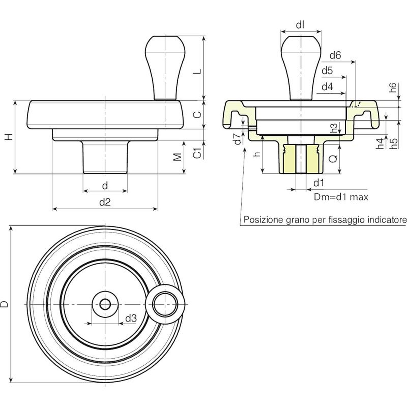 | Codice | art. | D | H | d | d2 | M | C | C1 | d3 | d4 | d5 | d6 | d7 | h | h3 | h4 | h5 | h6 | dl | L | Dm | d1 | Q | Peso (g) |