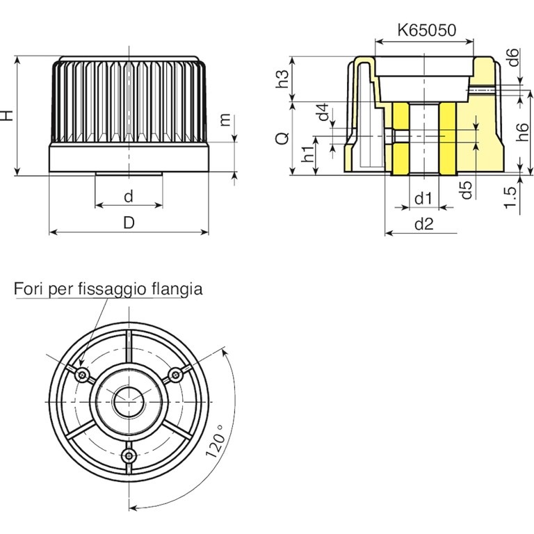 Codice | art. | D | H | m | d | d2 | d4 | d5 | d6 | h1 | h3 | h6 | Dm | d1 H10 | Q | Peso (g) |